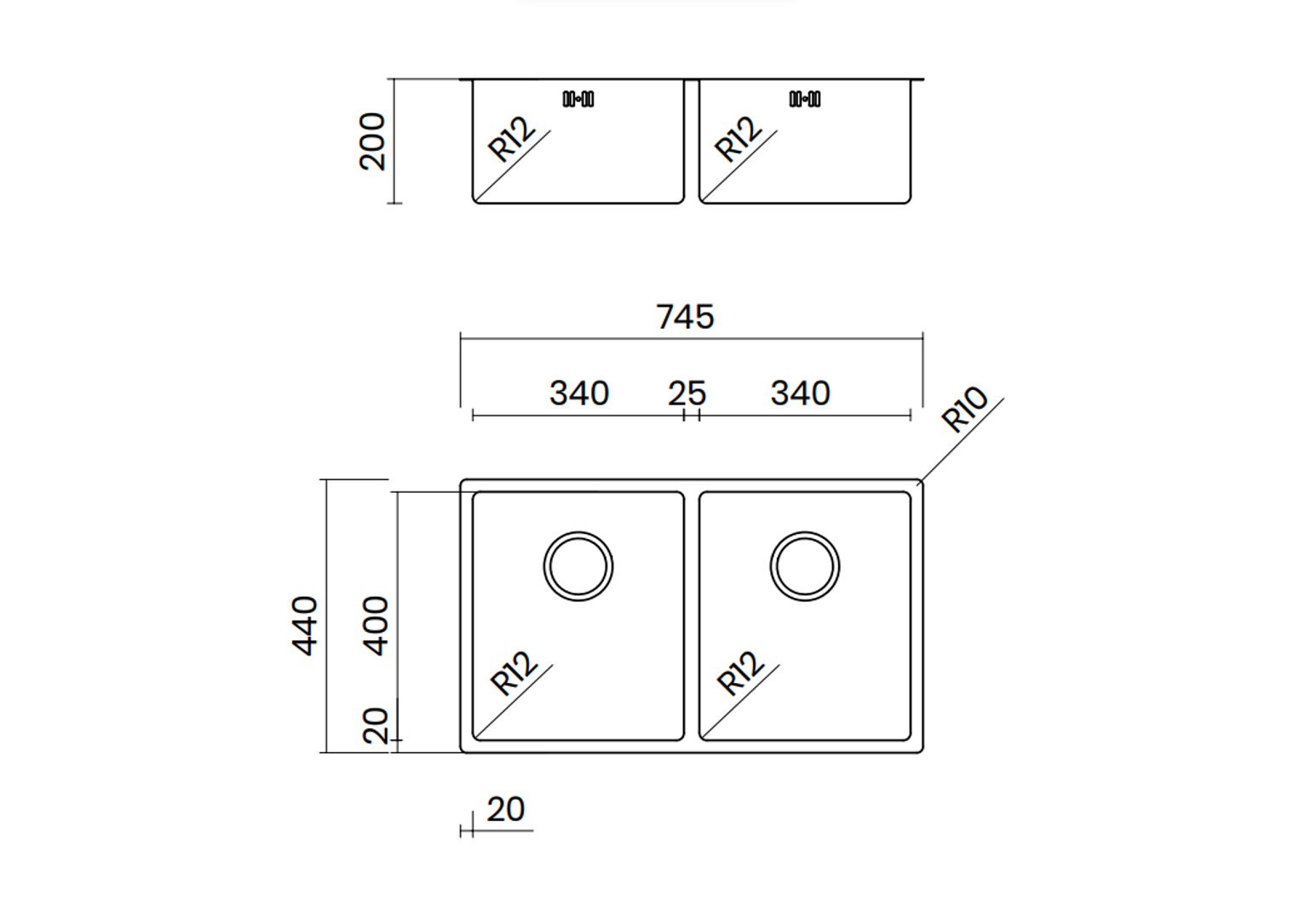 - Kích thước lòng chậu: 2 x 340x400 mm
