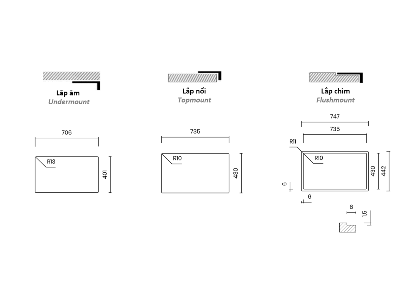 - Bo góc trong: 12 mm