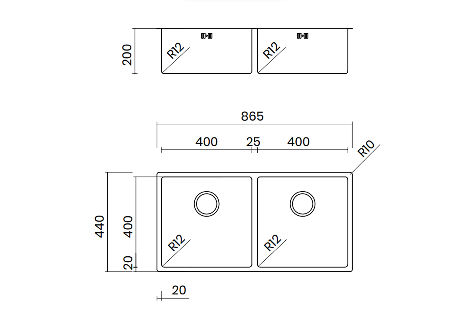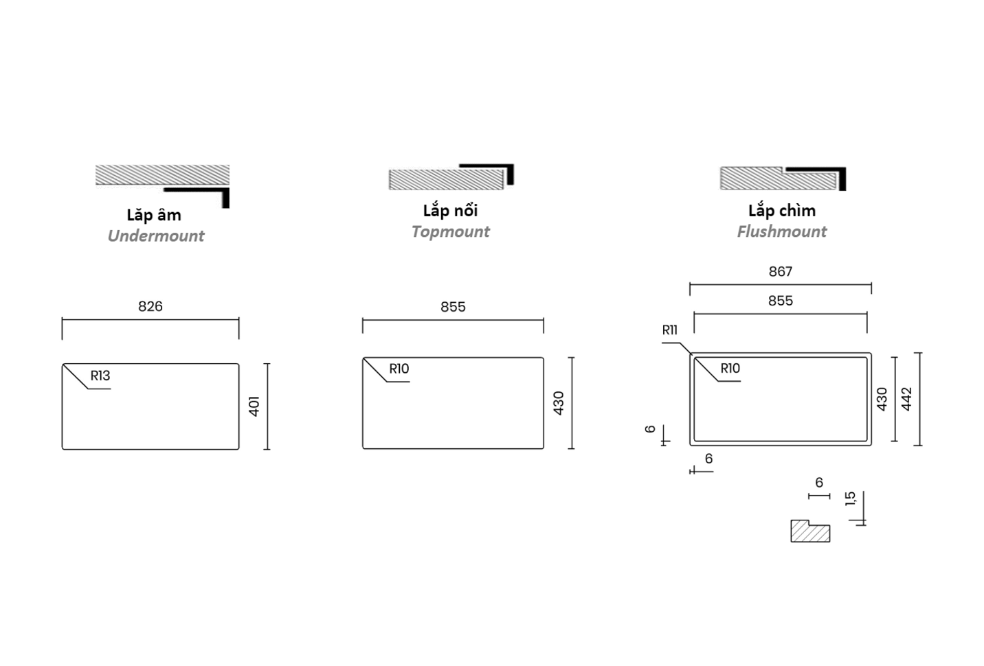 - Kích thước lòng chậu: 2 x 400x400 mm
